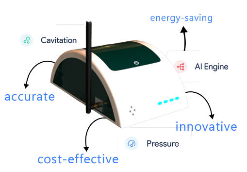 The CavFinder team created a portable monitoring kit that installs non-intrusively on facility surfaces. Using ML algorithms, it detects bubbles. The onboard AI engine, connected to the cloud, calculates cavitation probability.
